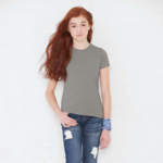 LAT Girls 4.5 Ounce Fine Jersey Longer T-Shirt. 4.5 oz. 100% combed ringspun cotton (Heather is 93/7) jersey. Topstitch ribbed collar. Side seam construction. Taped neck with EasyTear label. Double-needle hem sleeves and bottom. White is sewn with 100% cotton thread. CPSIA compliant-tracking label side seam