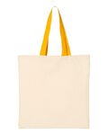Private Label Economical Tote Bag with Colored Handles. 100% Cotton sheeting, with colored handles. 15"W x 16"H. Ships from Stone Mountain, GA.